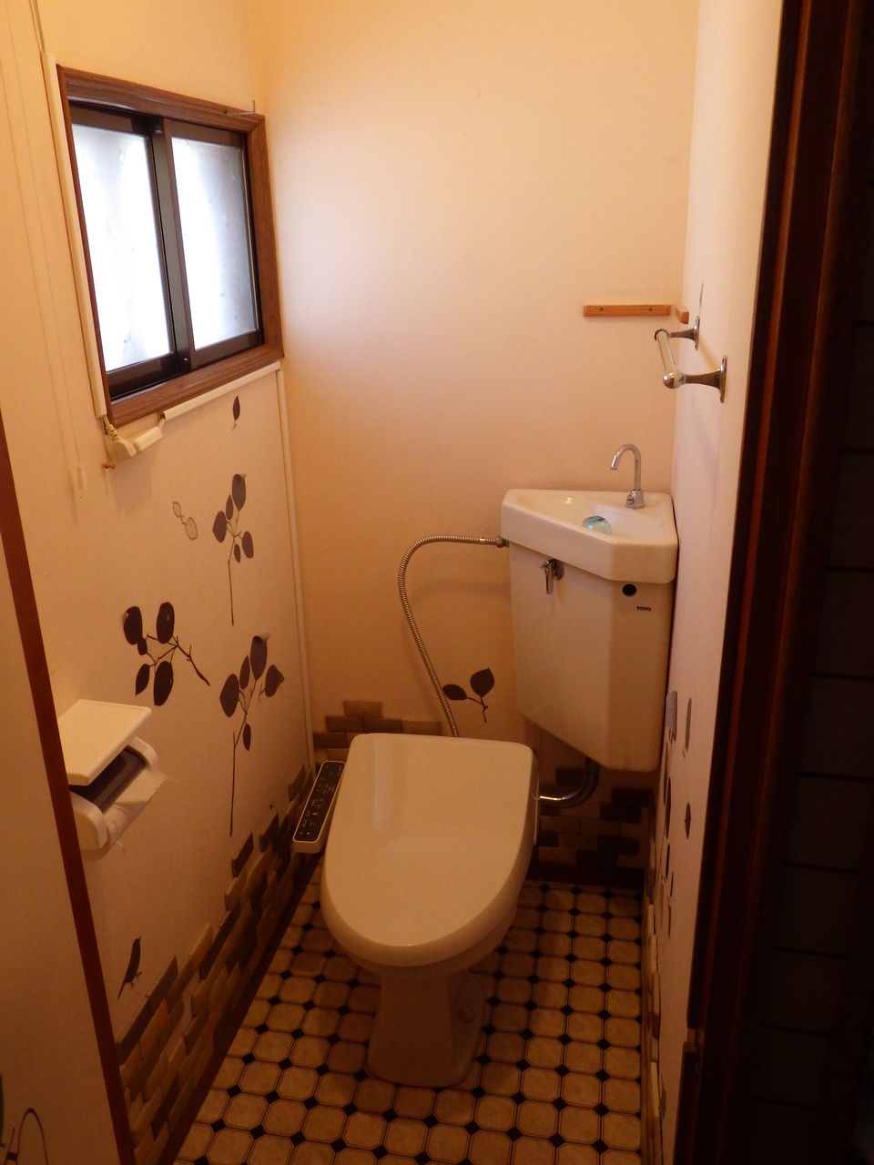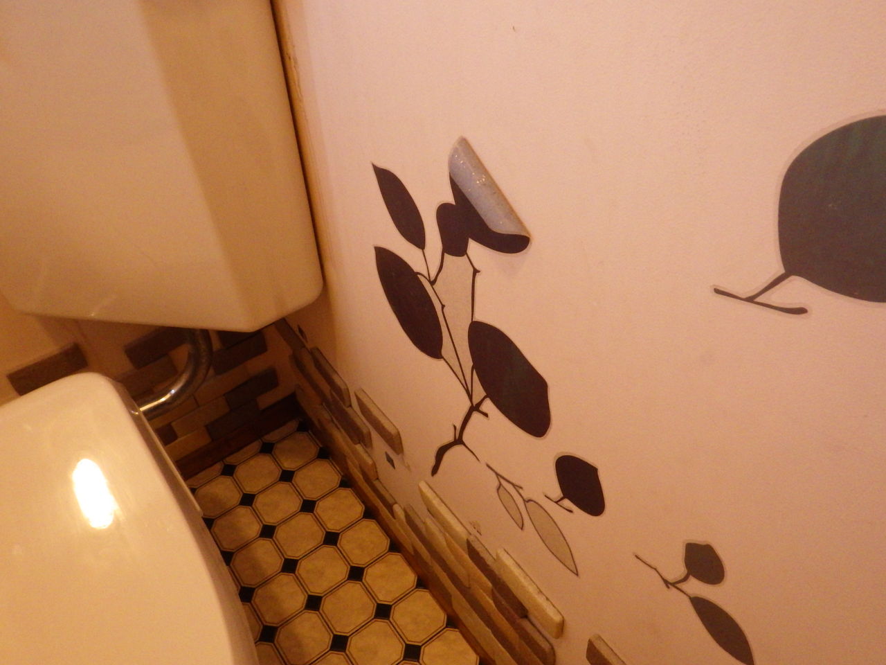 塗装前の下準備としてトイレ内壁に張り付けられている飾り類を外します。