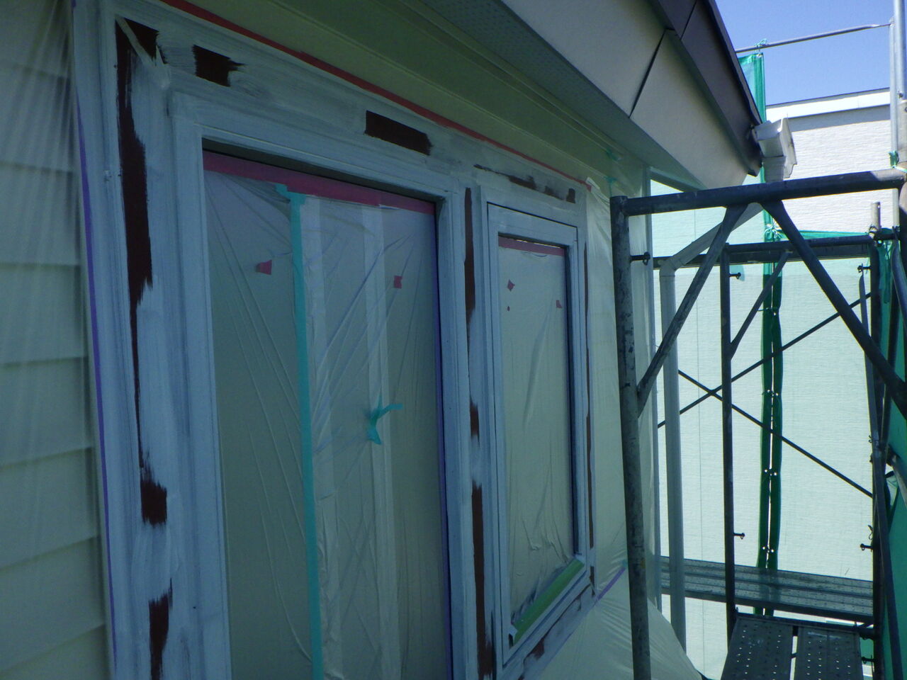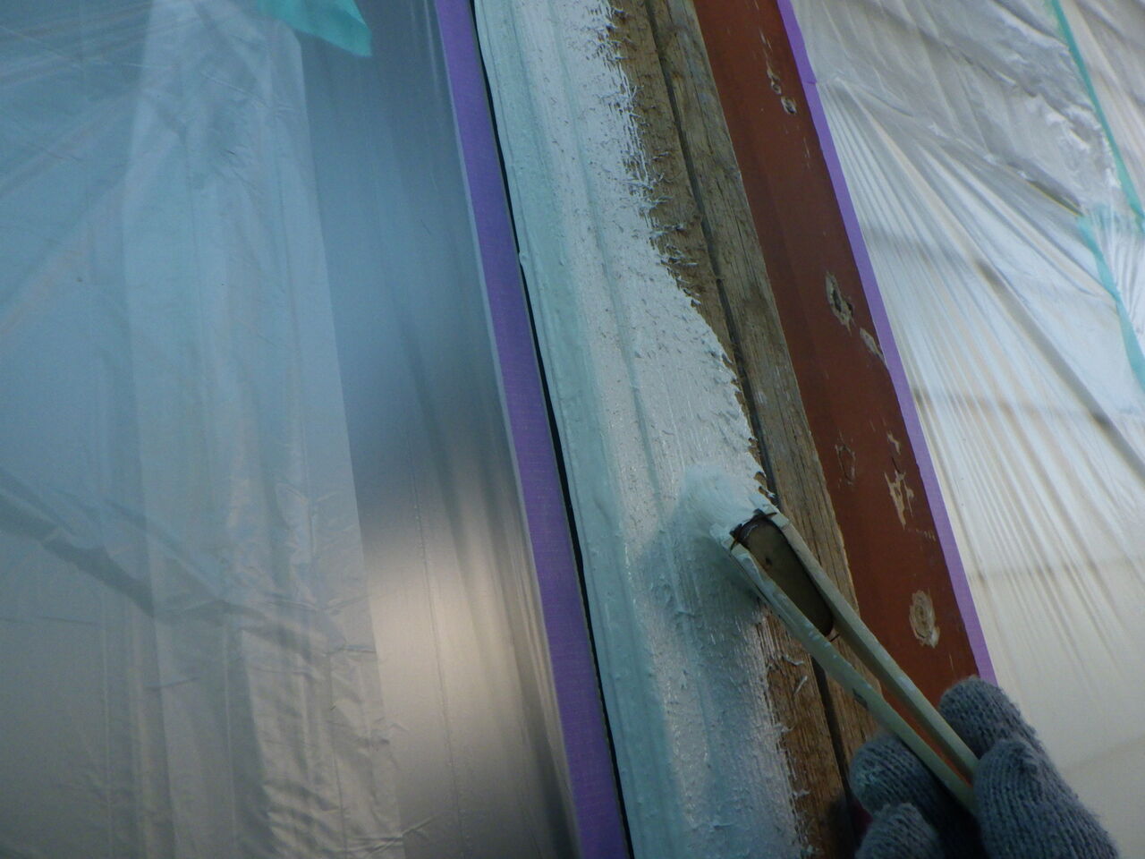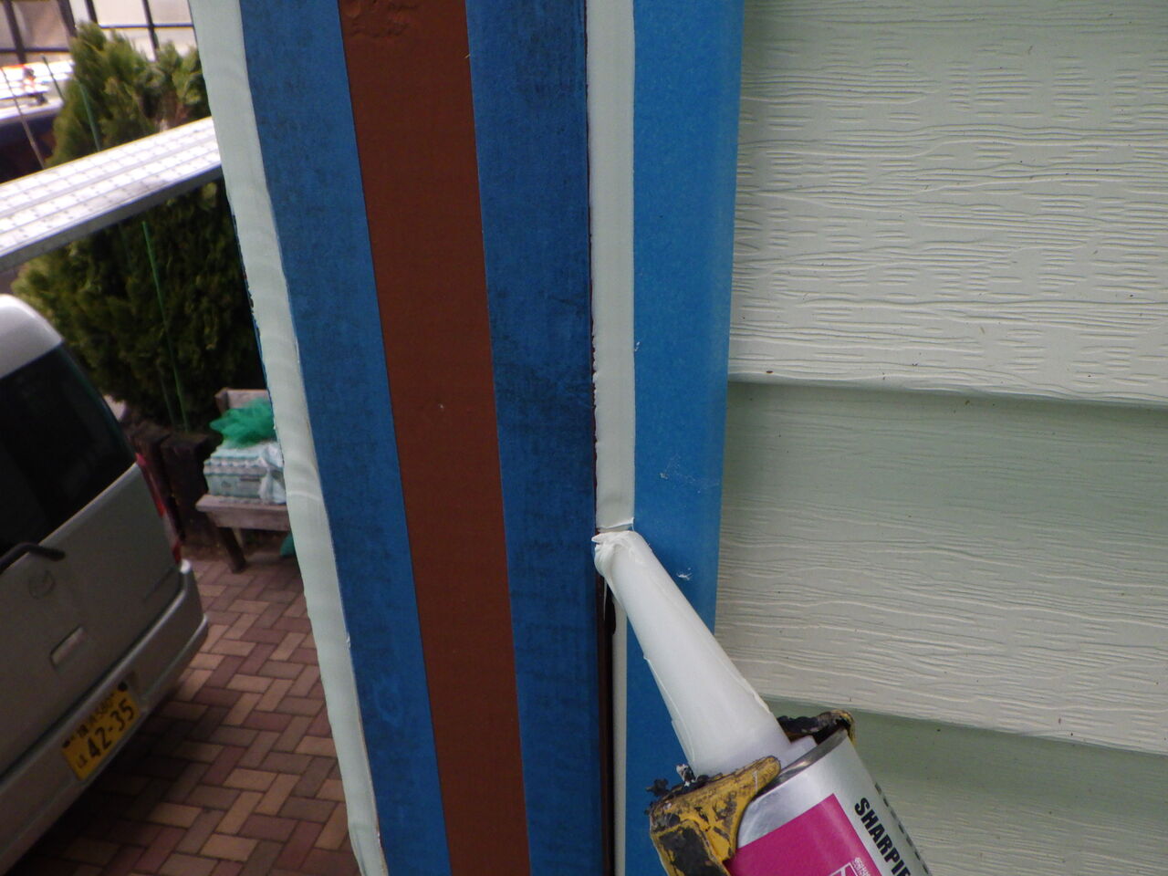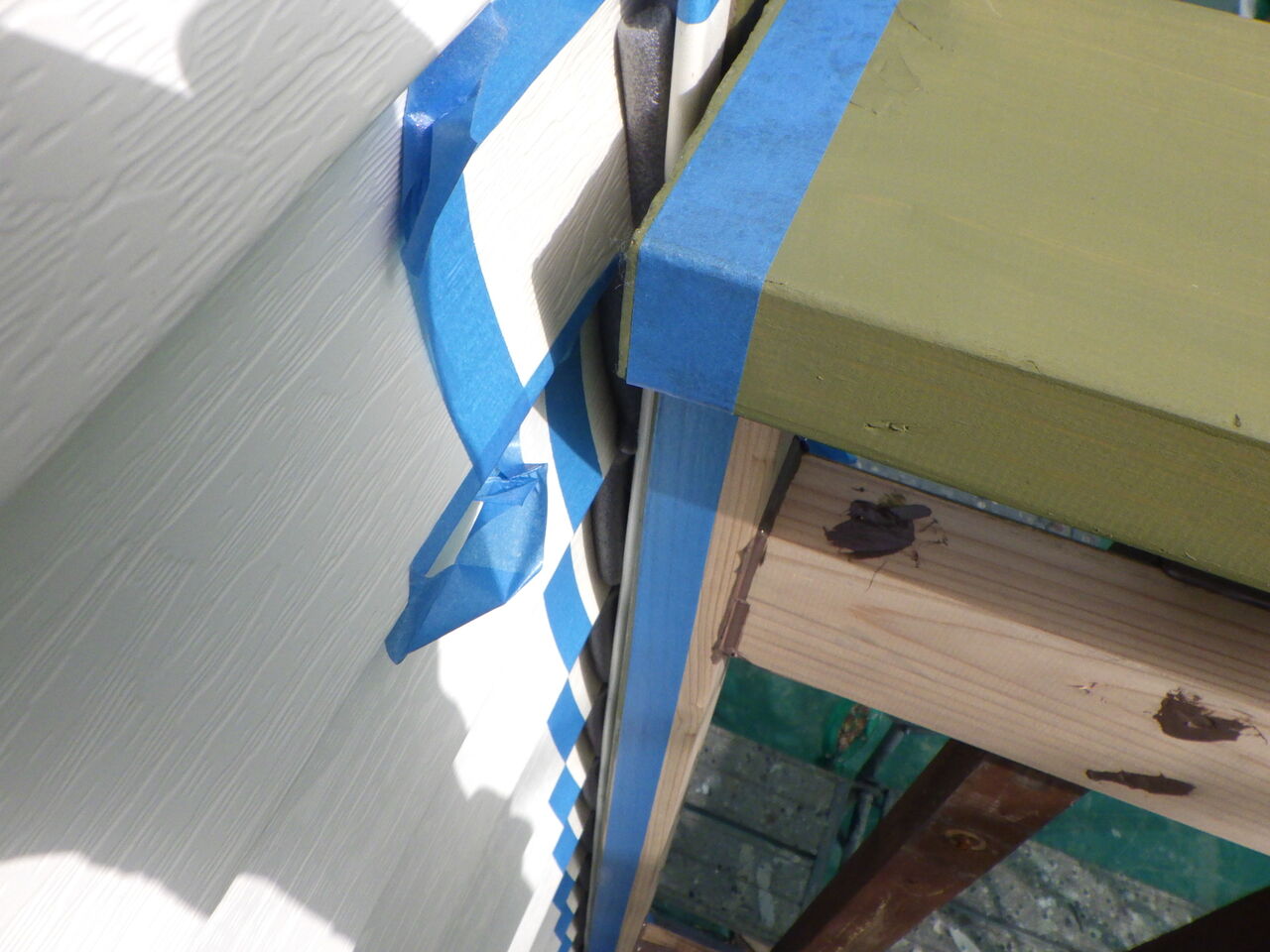 シーリング作業が終わり、養生作業を進めていると