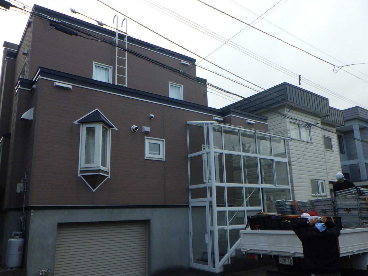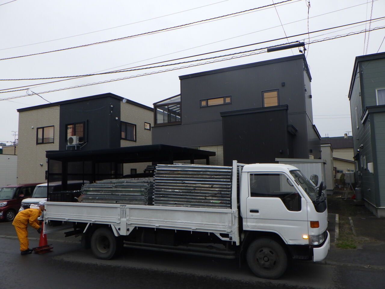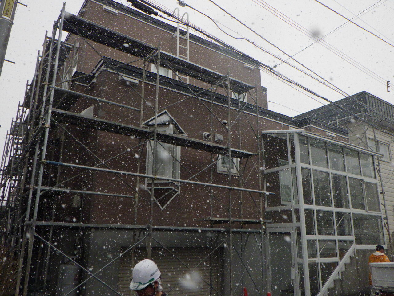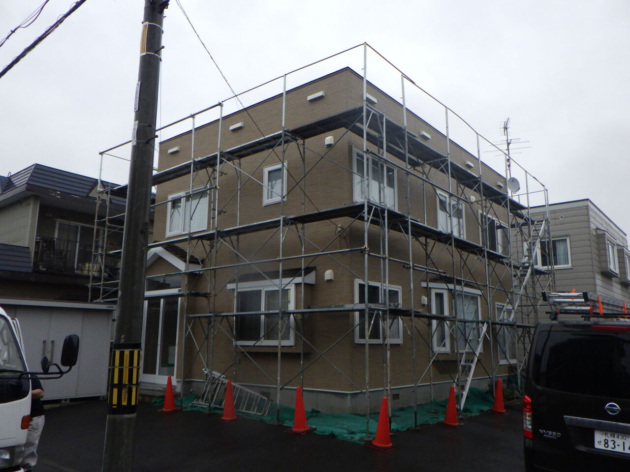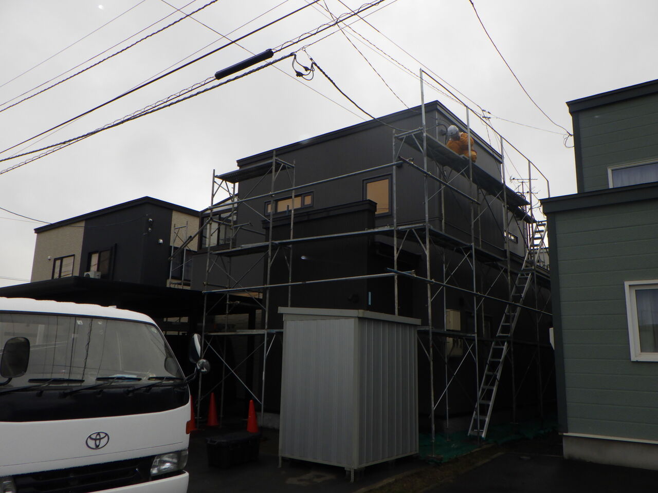 雨の日の足場仮設作業、いつものことですがお客様からのご理解が
