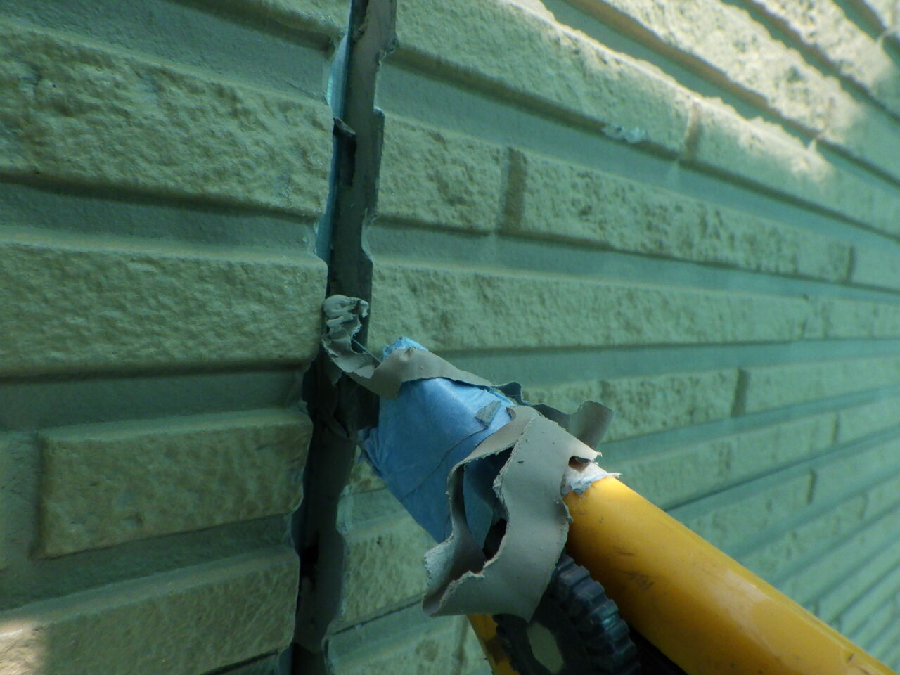 上の写真は既存シーリングの撤去作業途中の写真になります。