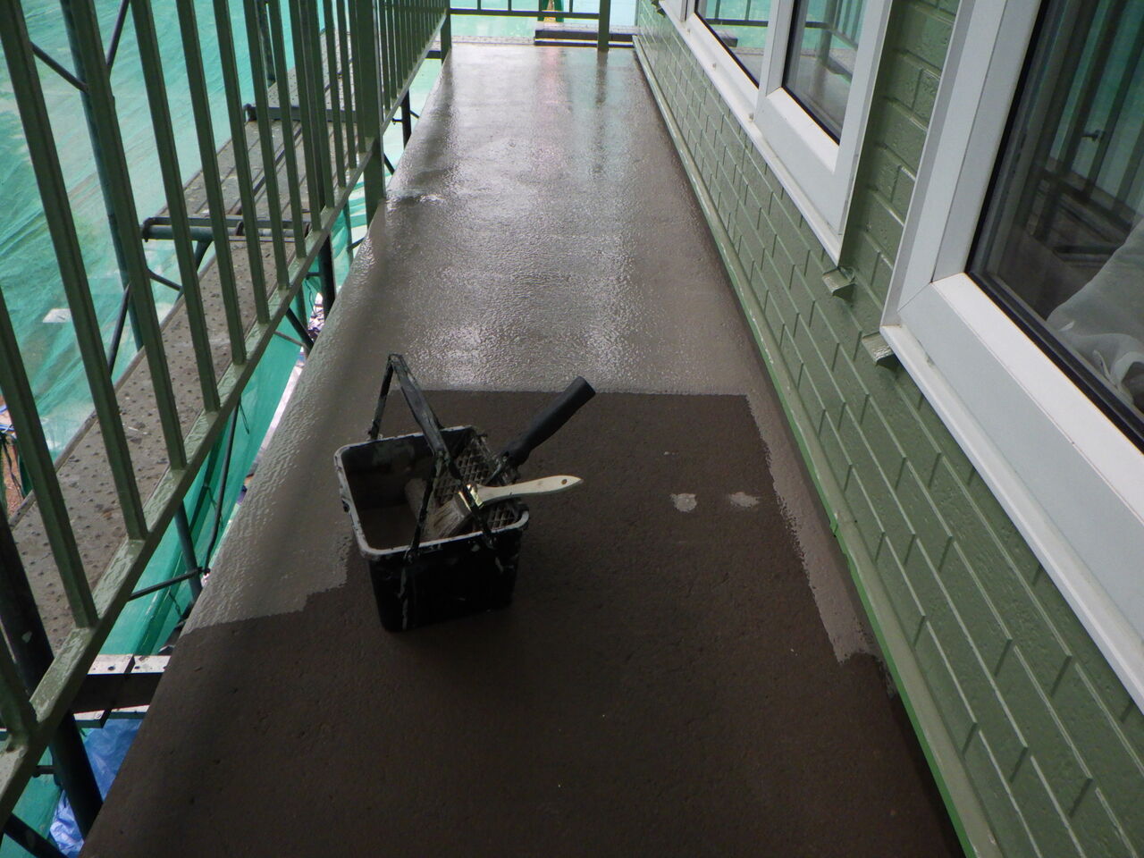 ポリマーセメント系防水材のプライマー塗装。