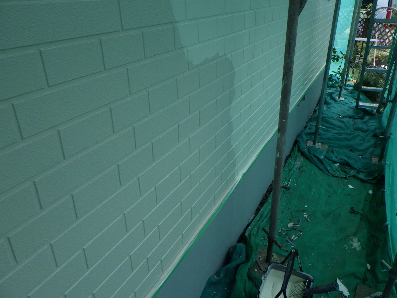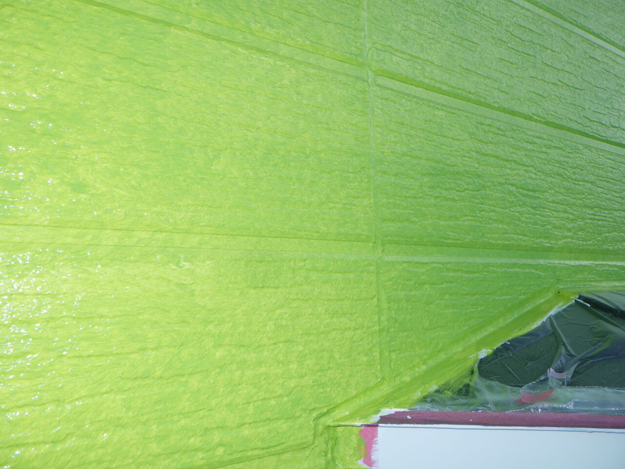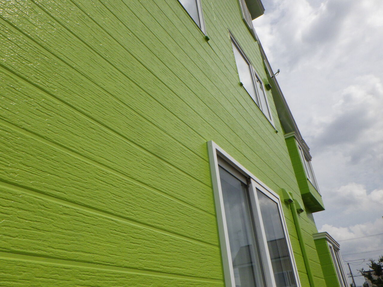 既存の外壁色が濃色で、仕上げ色は明るい緑色になるので