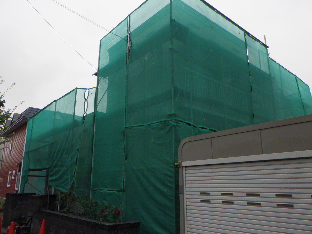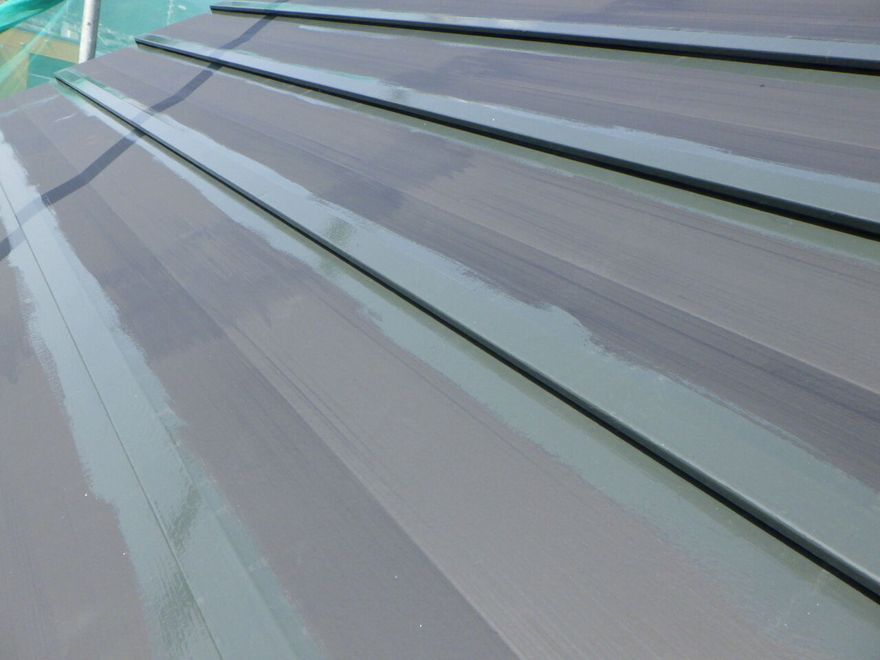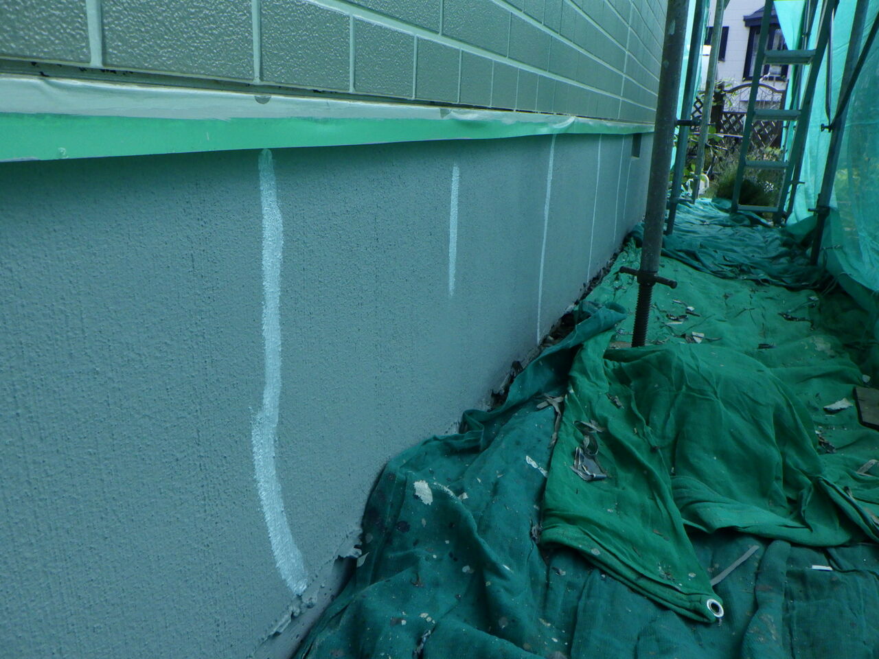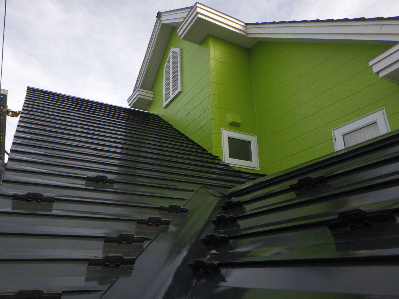 既存の外壁色が濃色で、仕上げ色は明るい緑色になるので