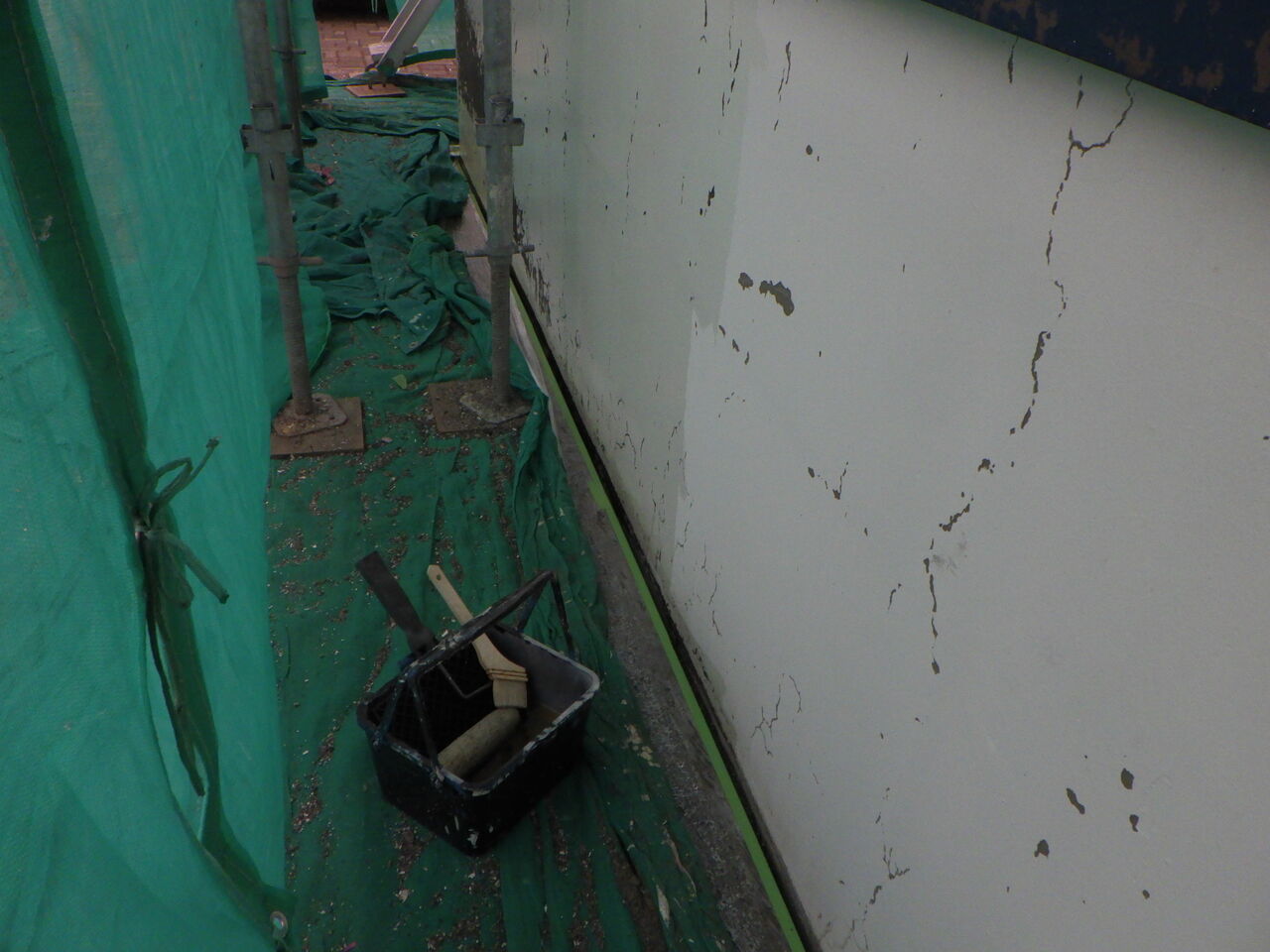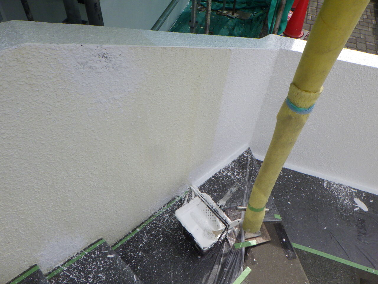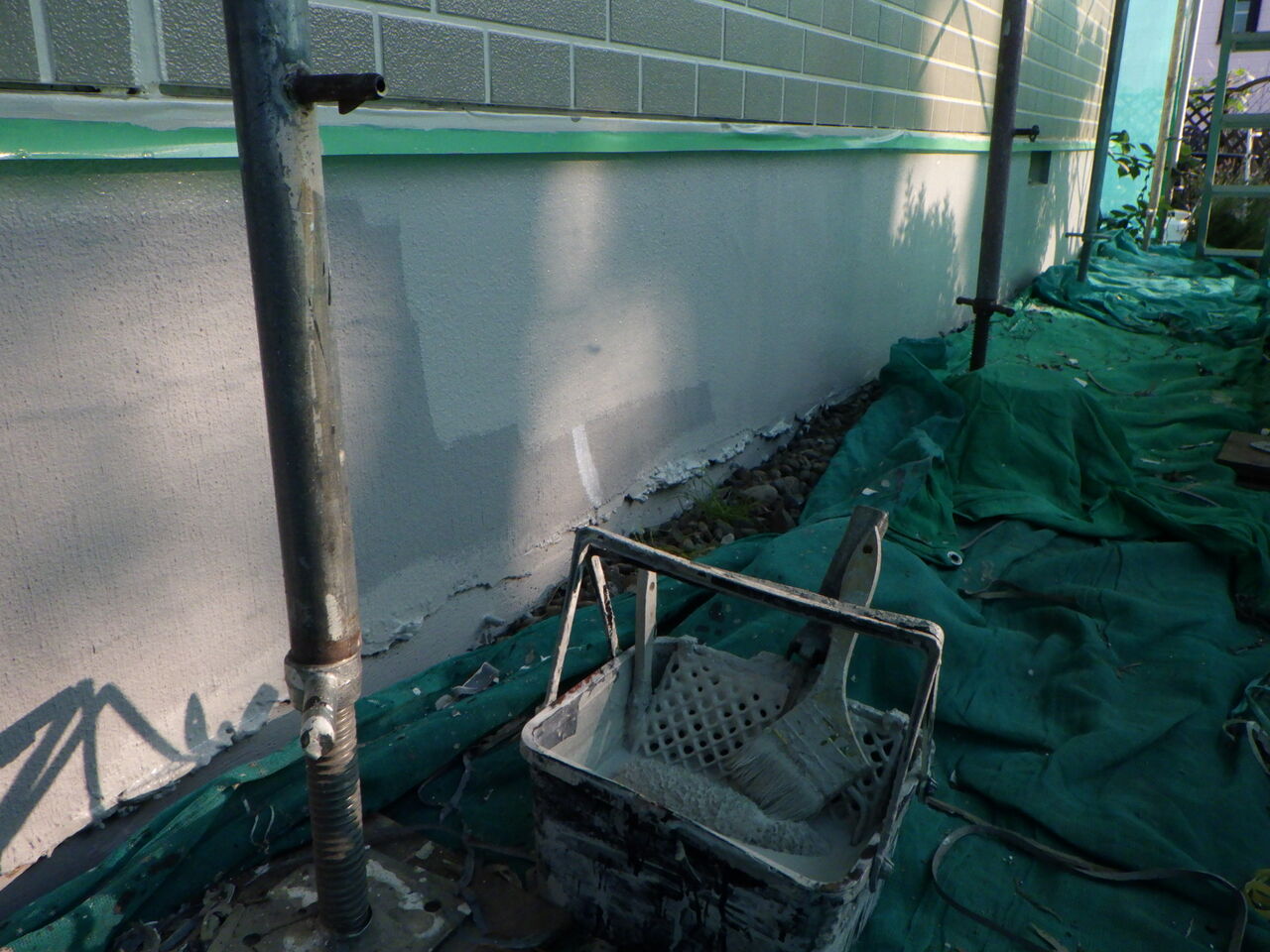 中塗り塗装後に再度凹凸やひび割れの凹部が目立つ箇所を補修。