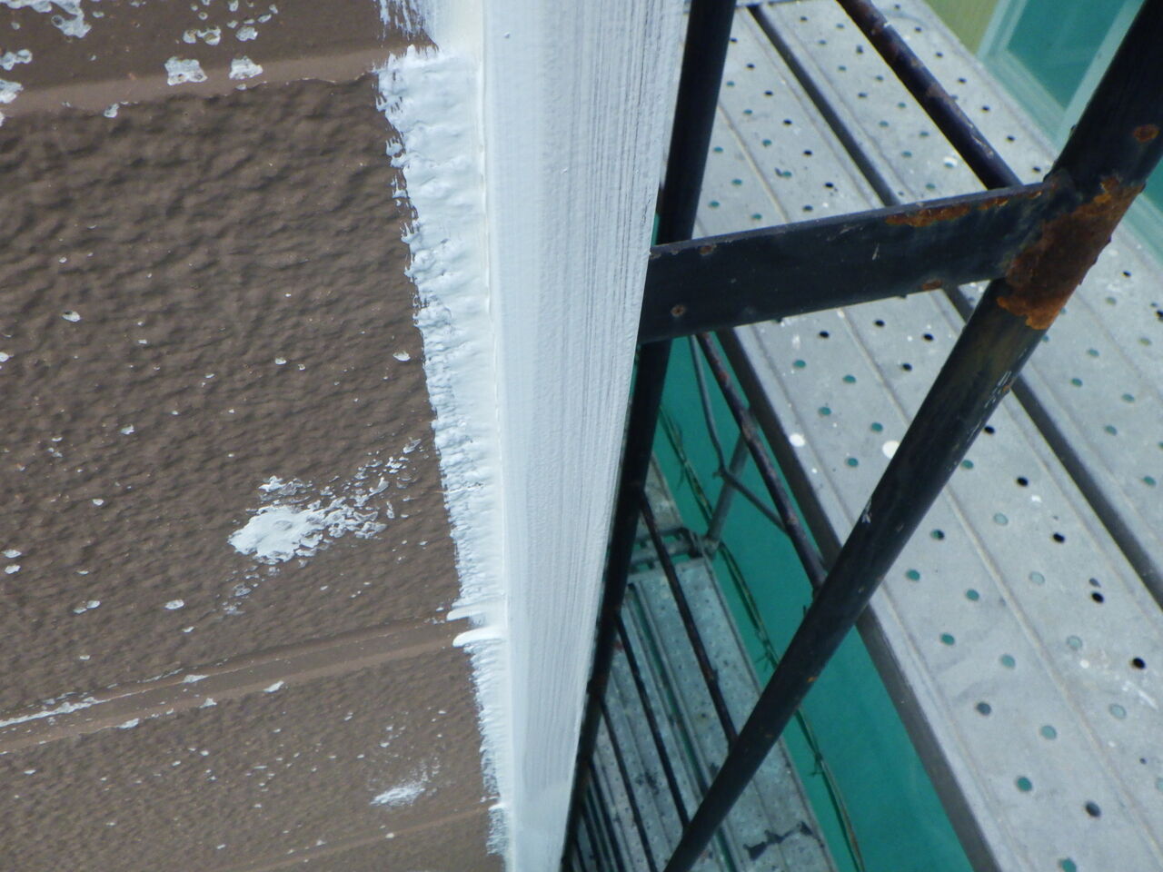 防水基材1回目塗装後に再度目立つひび割れ補修跡等を埋めていきます。