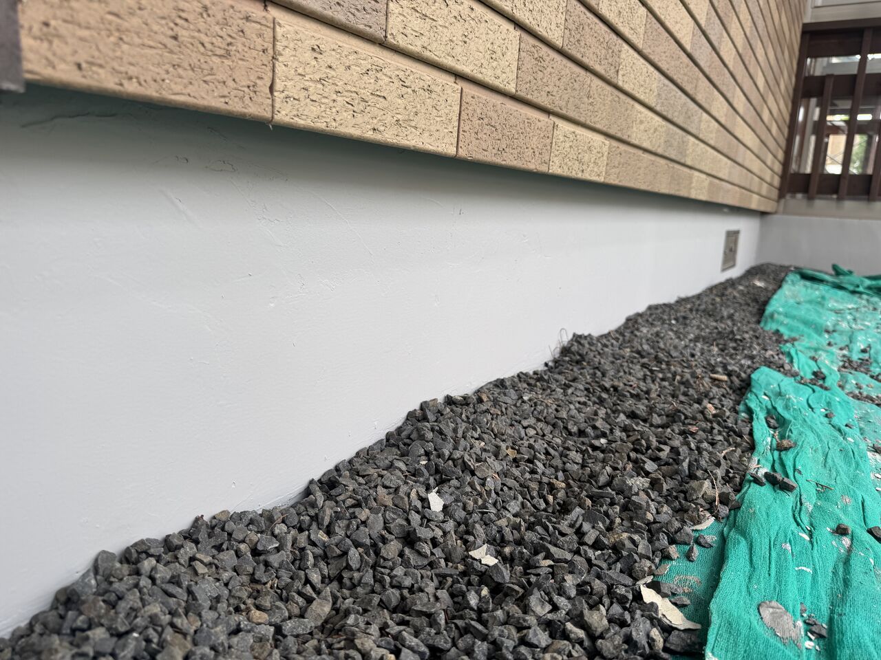 外壁は劣化が進み樹脂が粉化していたようで、高圧洗浄の水圧で既存塗膜の下、