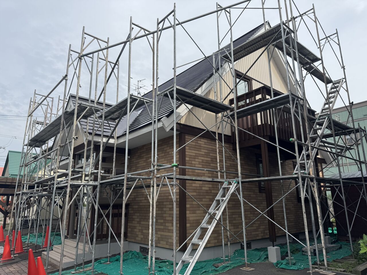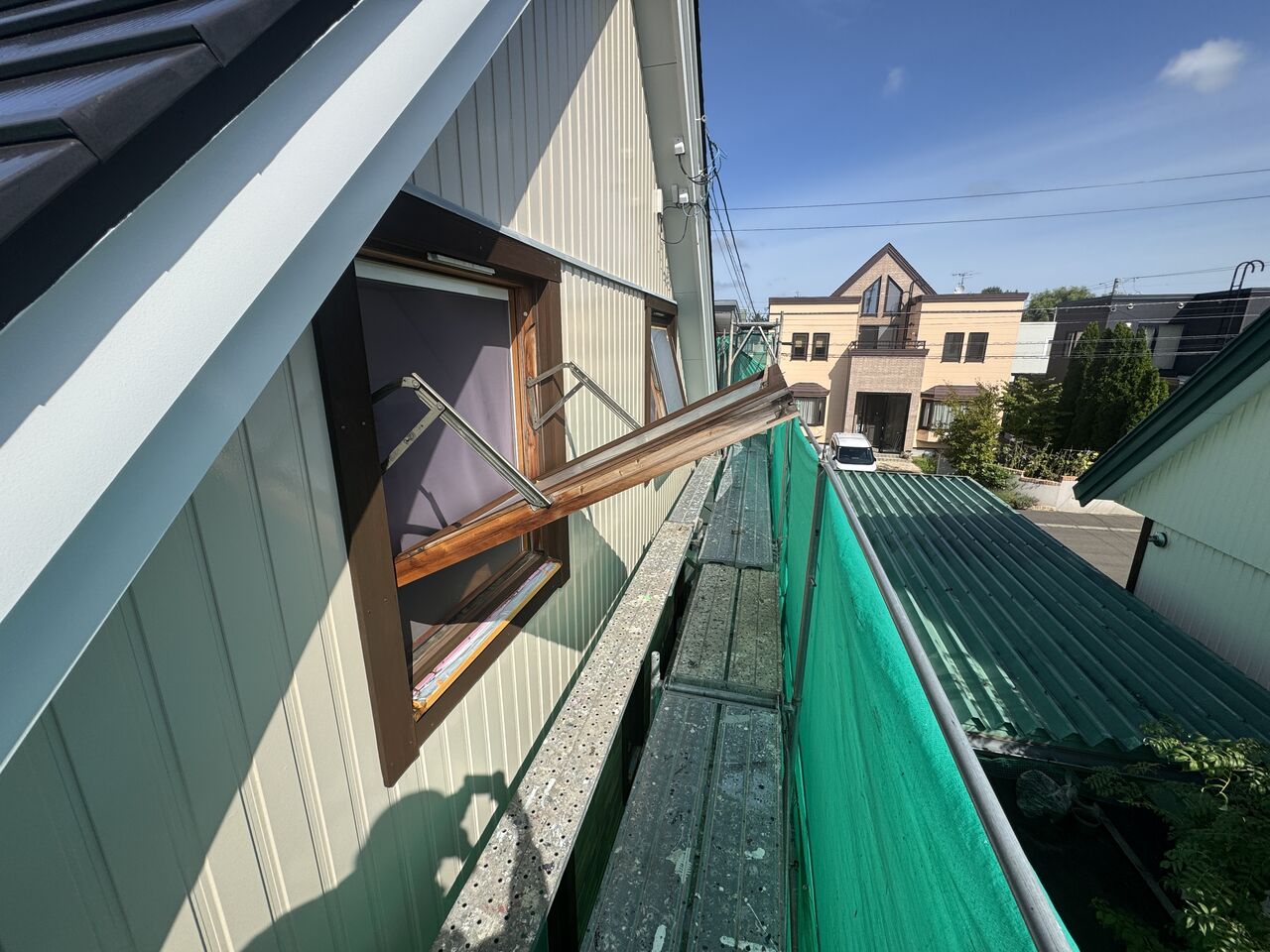 2階窓は足場を一部解体し、窓を回転できるようにしてから塗装します。