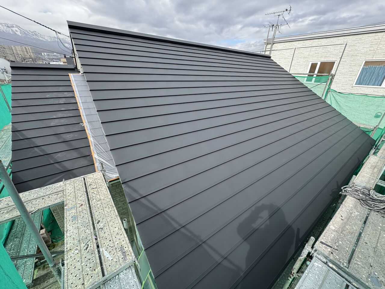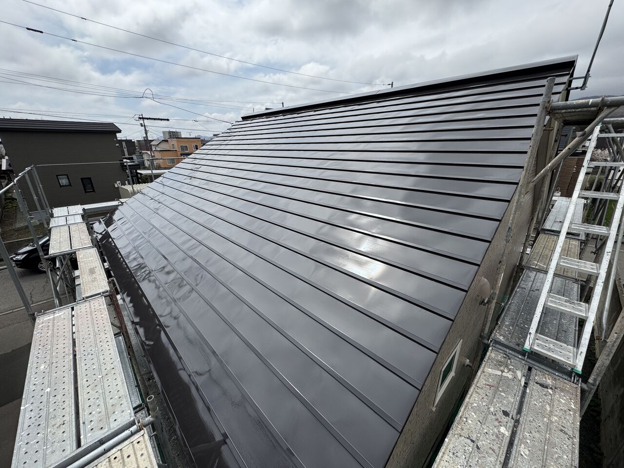 屋根下塗り黒色サビ止め塗装完了です。