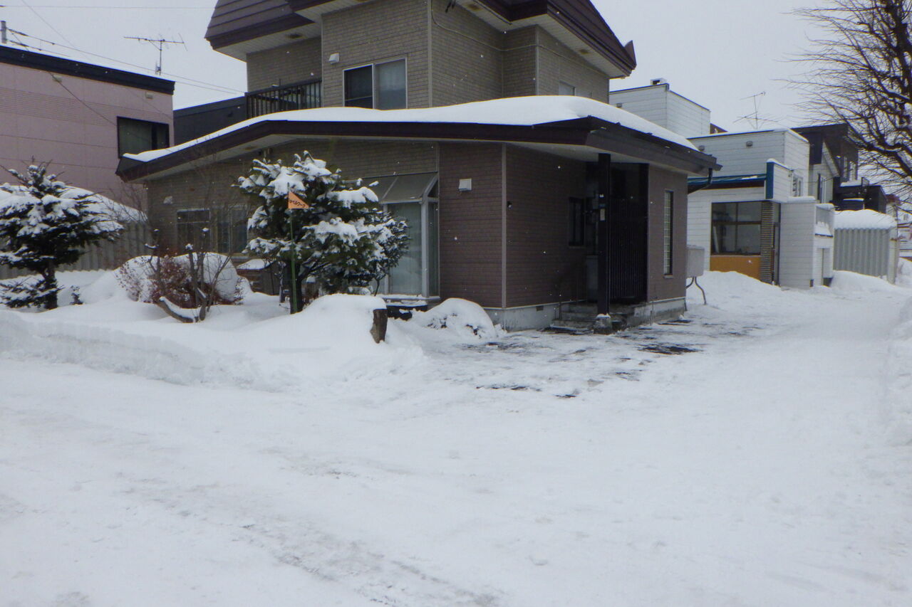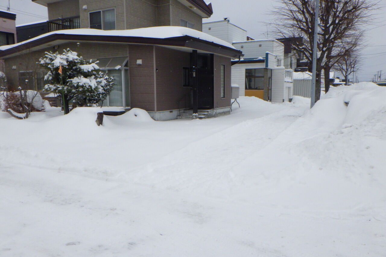 車庫と外壁の間に雪が溜まるようで、窓には板がはめられています。