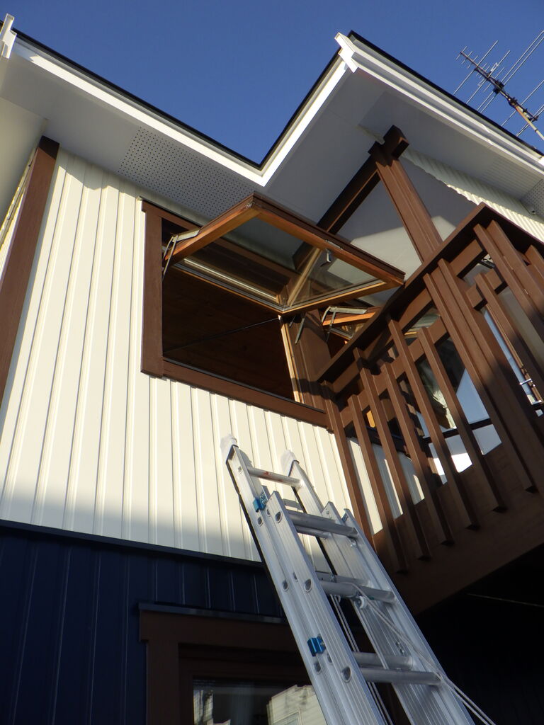 2F窓は梯子を使用、仕上がっている外壁に擦り跡が付かないよう